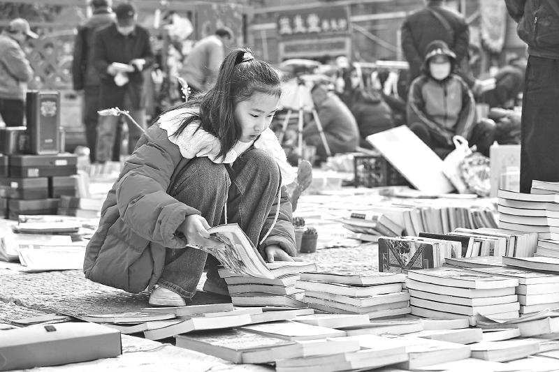 11月23日,江苏省淮安市清江浦文庙旧书市场现场热闹非常,空气中弥漫着淡淡的书香。每至周末,许多市民来到此处翻看选购心仪书籍,天气降温也挡不住市民的求知热情。