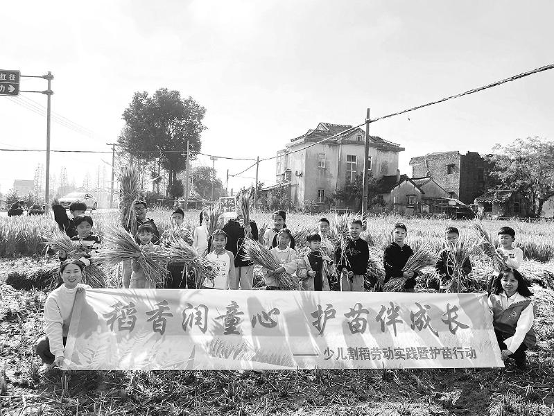 浙江省平湖市广陈镇开展主题为“稻香润童心 护苗伴成长”的少儿割稻劳动实践活动。 浙江省平湖市“扫黄打非”办公室 供图