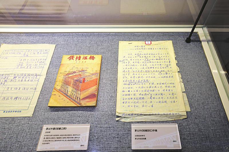 茅以升著《钱塘江桥》一书与《钱塘回忆》手稿。