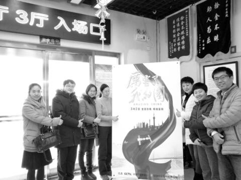 3月3日上午,中影小西天影院,中国建设科技集团员工观影前高兴地与《厉害了,我的国》海报合影。本报记者 章红雨 摄