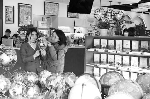 地图主题书店内一个个设计新颖、款式别致的地球仪引得读者纷纷关注。
