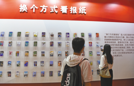 10月11日,为期5天的第三届数字中国建设成果展览会在福建省福州海峡国际会展中心开幕,观众在展会通过“换个方式看报纸”了解新闻资讯。