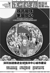 “双节同庆 家国同心”是《深圳晚报》在10月1日当天推出的封面大标题以及专版标题。头版封面中,一轮圆月映照下的红色背景,圆形轮廓中手持国旗的儿童庆祝国庆节的照片,两种节日元素的相互融合,展现出了浓厚的家国情怀。后面的4个专版,从各群体、各场合展示了深圳的节日气氛,从幼儿园300平方米的巨幅国旗,到养老院老人写书法,再到马路、公园各处的姹紫嫣红,《深圳晚报》用大量现场图片以及生动文字展示出了双节喜庆氛围下的活力深圳。