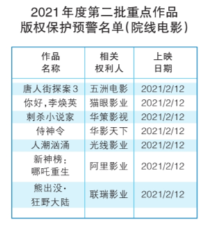 当日,国家版权局发布了“2021年度第二批重点作品版权保护预警名单(院线电影)”。国家版权局要求:直接提供内容的网络服务商在影片上映期内不得提供版权保护预警名单内的作品;提供存储空间的网络服务商应禁止用户上传版权保护预警名单内的作品;相关网络服务商应加快处理版权保护预警名单内作品权利人关于删除侵权内容或断开侵权链接的通知。同时,要求各地版权行政执法监管部门应当对本地区主要网络服务商发出版权预警提示,加大版权监测监管力度。对于未经授权通过信息网络非法传播版权保护预警重点作品的,应当依法从严从快予以查处。