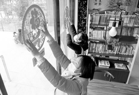 2月7日,在河南省洛阳市汝阳县文化广场城市书房内,管理员在书房玻璃窗上贴窗花。