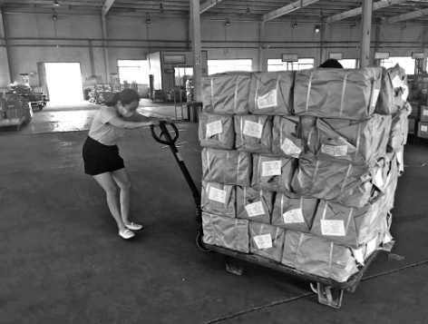 下午两点,有一辆大车拉着教材从外地抵达。集装箱货柜打开的同时,叉车已在一旁待命,一整垛、一整垛的被牛皮纸包裹的教材有序地被叉车转运到手动液压搬运车上。记者在接受培训后,尝试着拉起眼前的一整垛书,这是一垛5层高、每层16包的庞然大物,记者在起步之前先使劲压了几次黑色的牵引手柄,在拉起的那一刹那还需要旁边的师傅助力,可最难的还是让这近一吨重的货物停下来。“这需要巧劲儿,没个一年半载掌握不了。”一直在旁边指导的储运库主任冯鹏说。