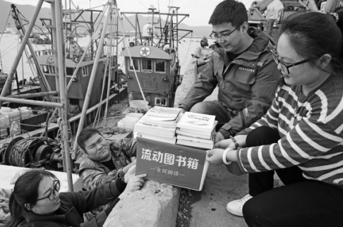 10月18日,江苏省连云港市连云区连岛街道的党员志愿者将“流动图书箱”送上渔船,供渔民选择阅读。