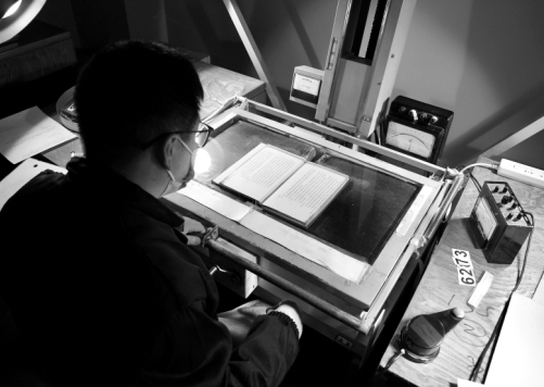 11月26日,在位于北京的国家典籍博物馆内,工作人员正在进行古籍保护缩微数字一体化展示。