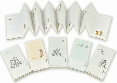 印制亮点:黑白线描的单色调三册书述说着童年的歌谣和往昔记忆,而写意的四色印刷三册书中,灵动分布的顽童更是充满童趣。