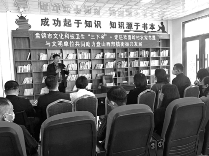 这是由盘锦市委宣传部、市新闻出版局、市精神文明办、市卫健委、市科协、《北方水稻》编辑部共同开展的文化科技卫生“三下乡”走进农家书屋活动,他们充分发挥农家书屋与新时代文明实践中心深度融合示范作用,推动全民阅读进乡村。