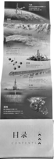 中国科学技术出版社《从深海到深空:科技征程的中国坐标》的目录以一张竖图拉页呈现,按从深海到深空的顺序从下向上排布内容。