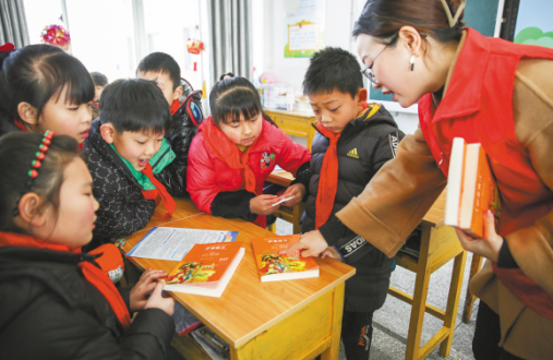 2月16日,在江苏省如皋市长江镇港城实验小学,学生们正在学习鉴别盗版相关知识,并参与共读一本好书、知识答题等活动。