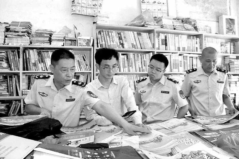 2023年5月5日,湖北省黄梅县小池镇联合江西省九江市、黄梅县文化执法部门开展校园周边书店检查行动。 黄梅县委宣传部 供图