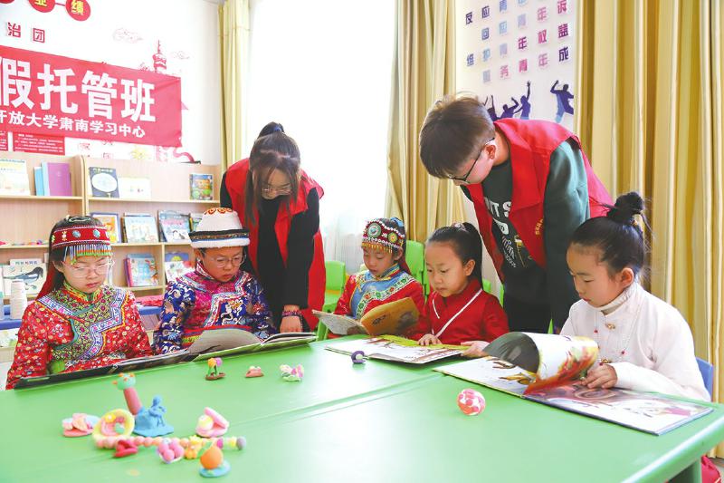 在肃南县大河乡“牧童之家”,志愿者陪伴学生们阅读课外书。肃南县融媒体中心 供图