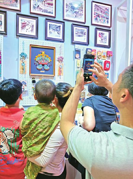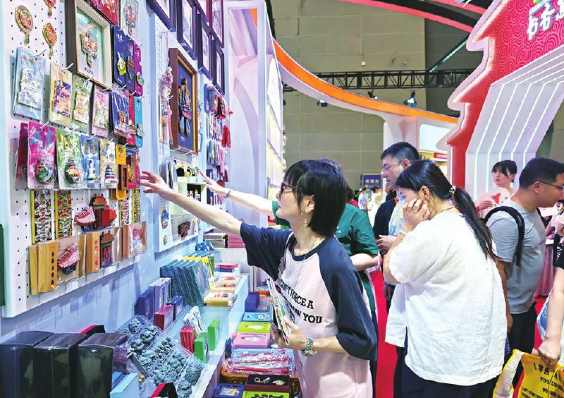 “这款只剩最后一个了。”“这个中轴线冰箱贴是我们北京图书大厦联名特别款。”7月26日,北京图书大厦工作人员在第33届全国图书交易博览会北京展区接待了一批又一批来自全国各地的读者,他们竞相在璀璨夺目的凤冠挂件前打卡拍照,国潮文创成了展区里的明星展品。