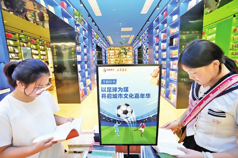 8月4日,江苏省城市足球联赛正如火如荼地进行,苏州观前街新华书店特设置“苏超”书籍专柜,介绍联赛各城市深厚的文化底蕴,吸引读者前来阅读。