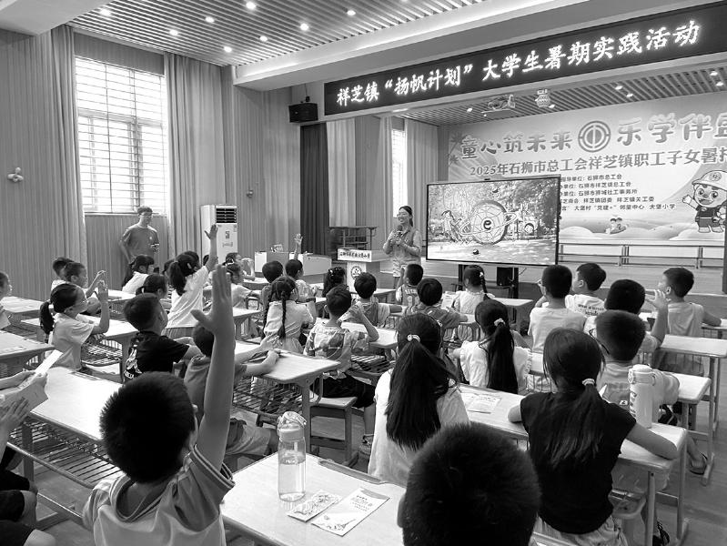 泉州石狮市祥芝镇“扫黄打非”办公室工作人员走进大堡小学暑托班,开展“扫黄打非·护苗2025”暨“绿书签行动”宣传教育活动,动画和游戏让孩子们轻松掌握知识,为孩子们带来生动有趣的“护苗”小课堂。在观看“扫黄打非”宣传视频后,知识抢答环节掀起热潮。“哪种行为正确?A.买盗版光碟;B.举报非法出版;C.浏览不良网站。”主持人话音刚落,举起的小手如林。