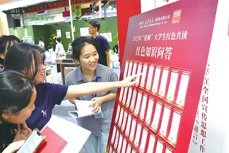 图为湖北新华打造的“倍阅书店”本次被搬进武汉书展,集成了阅读、生活、文创、咖啡及数字阅读体验,其打造的红色知识互动场景,吸引年轻读者参与。