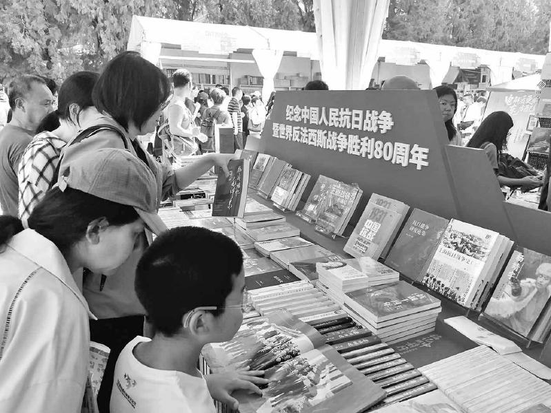 2025“我与地坛”北京书市现场,纪念抗战胜利80周年主题图书展台吸引读者驻足。 本报记者 范燕莹 摄