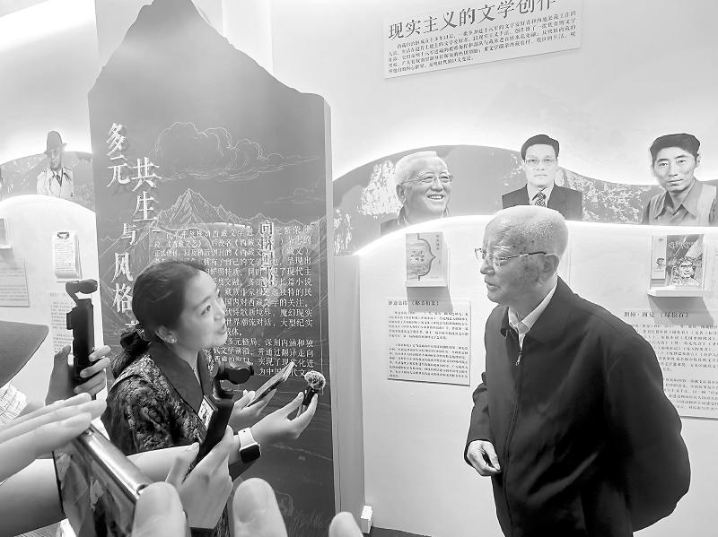 “向祖国汇报——西藏自治区成立60周年文学成就展”展厅内,87岁的降边嘉措接受采访,介绍《格桑梅朵》的创作故事。