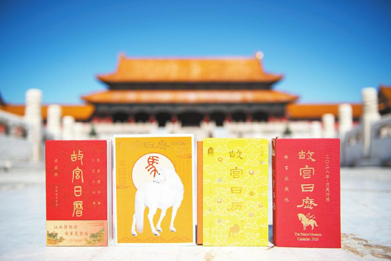 和历年的火爆场面别无二致,2026年《故宫日历》(故宫出版社)刚一推出,便跃居“爆款”之列,包括生肖版、书画版、青春版和汉英对照版4个版本。2026年是丙午马年,《故宫日历》生肖版循着骏马、科举、文房、鸿儒的脉络,把紫禁城的历史、艺术与文人传统串成一条绵延不断的文化长河,并以藏品彰显教育为国之根本的理念,阐释尊师重教的道理。生肖版封面采用画家郎世宁绘制的乾隆帝爱驹,背景的主体颜色为橙色,给人充满活力、蓬勃奔放之感,更蕴含马到“橙”功、所愿皆“橙”的美好寓意。从1月“马到成功”开篇,到12月“文光射斗”华彩收束,其中内容延续了《故宫日历》的经典设计,每天一个故宫博物院的馆藏文物及其详细介绍,高清大图呈现文物的精彩。