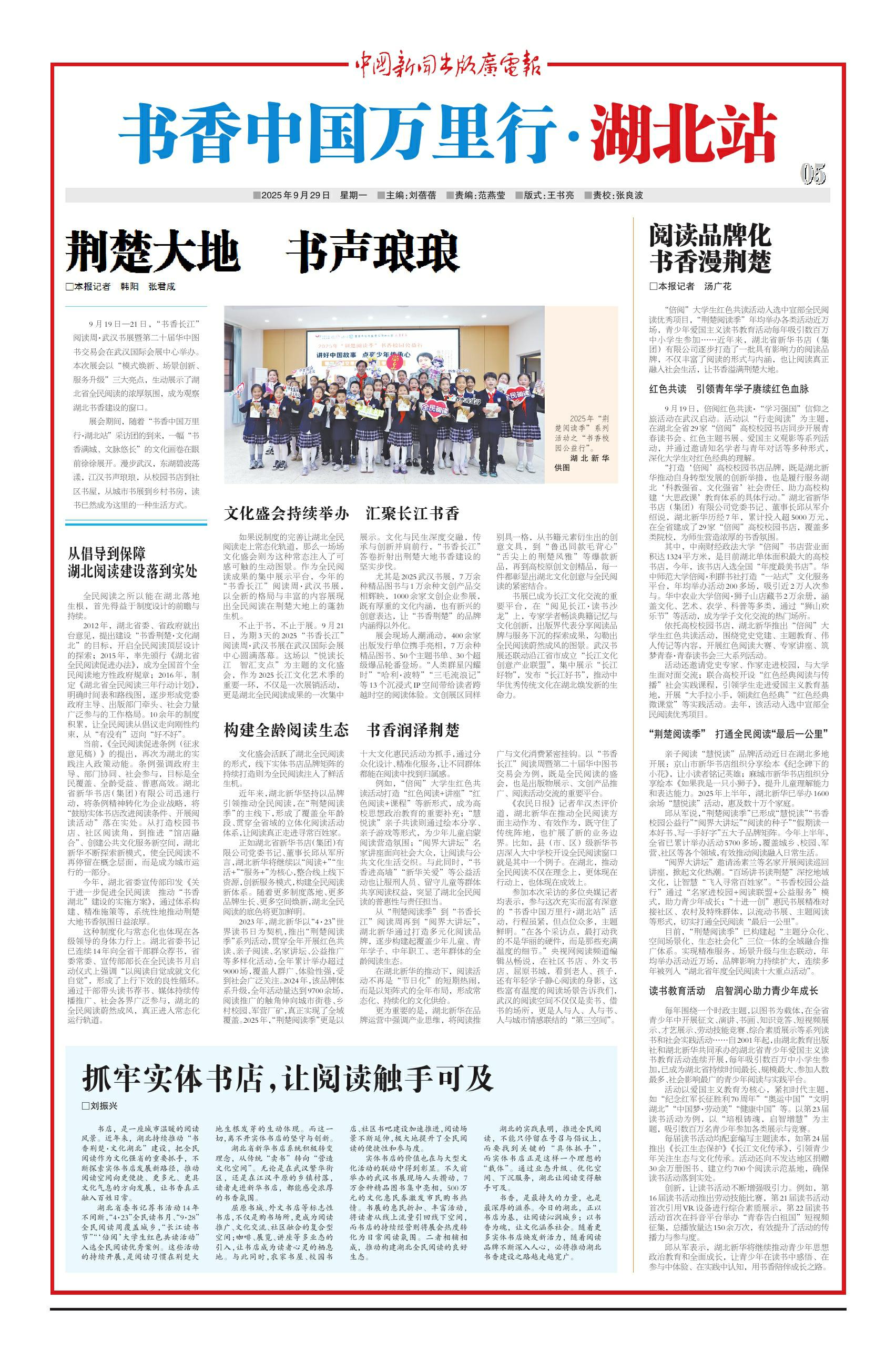 “倍阅”大学生红色共读活动入选中宣部全民阅读优秀项目,“荆楚阅读季”年均举办各类活动近万场,青少年爱国主义读书教育活动每年吸引数百万中小学生参加……近年来,湖北省新华书店(集团)有限公司逐步打造了一批具有影响力的阅读品牌,不仅丰富了阅读的形式与内涵,也让阅读真正融入社会生活,让书香溢满荆楚大地。
