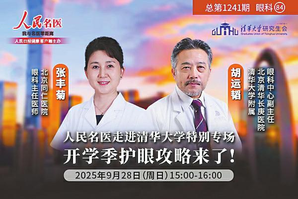 《人民名医》直播节目是由人民日报社健康客户端主办的名医疾病知识直播互动栏目。栏目定向邀请全国各专业学科带头人、三甲医院领导及科室主任、著名临床专家与网友线上交流。由于全国科普月在9月,又值开学季,《人民名医》直播节目便在9月28日举办了清华大学特别专场,邀请北京同仁医院和清华大学附属北京清华长庚医院的眼科相关专家,聚焦大学生近视防控热点,为莘莘学子送上一份专属开学季护眼指南。在高强度课业和屏幕使用下,如何避免视力“亮红灯”?眼睛干涩疲劳怎样缓解?近视度数持续增长,有哪些前沿防控手段?直播节目中,两位眼科权威专家走进校园,带来了专业又实用的护眼攻略,助力高校青年看清未来,明亮启程。