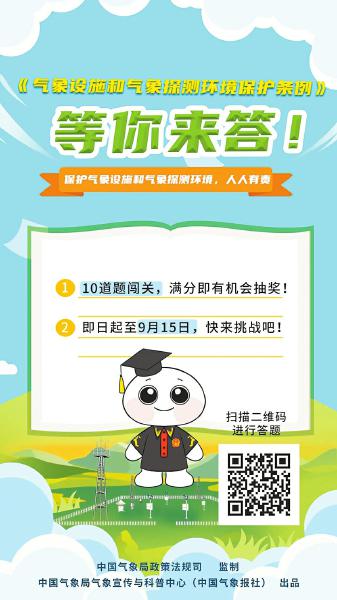 为进一步加强气象普法宣传,提升公众气象法治素养,中国气象报社在新媒体平台启动了“一月一主题”的气象法律法规知识问答活动。9月气象法律法规知识问答活动的主题是《气象设施和气象探测环境保护条例》,用户通过“中国气象”微信公众号及中国气象科普网参与答题,只需答对全部10道题目,就有机会参与抽奖,极大提高了公众对于气象知识科普内容的积极性和参与性。