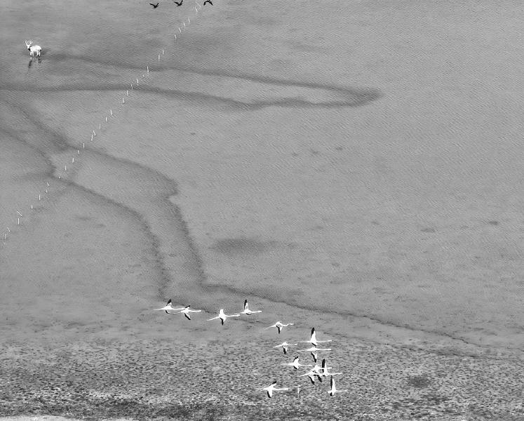 “意外”接踵而来。我收回无人机查看刚刚拍摄的成果,在几百张图片中,看见了这张让我兴奋不已的摄影作品。画面的左上角,正是我此行的目标——麋鹿,下方则是飞行中的火烈鸟。众里寻它不见踪影,画面中的麋鹿却刚好回首,看向火烈鸟的方向,两者交相呼应,整个画面干净利落,宛如一幅油画,这个稍纵即逝的瞬间被定格,让我内心的激动与震撼难以言表。