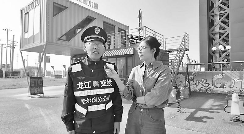 王迪(右)在哈尔滨南收费站采访黑龙江省高速通行保障情况。(本版图片均由作者提供)
