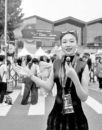 邵小芸在首钢园区的WTT赛场外现场直播,向观众详细介绍WTT中国大满贯赛的热烈气氛。
