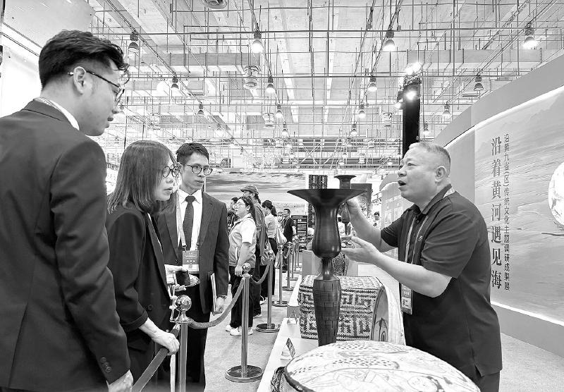 “这是山东有名的蛋壳陶,厚度只有0.2毫米!”青岛大学锦绣非遗研究中心主任、青岛手造节活动区负责人侍锦,向来自世界各国的版权部门工作者宣传着在此展出的黄河九省非遗工艺品。这个外表漆黑油亮,陶胎薄如鸡蛋壳的黑陶深深吸引了外方嘉宾的目光,他们接过侍锦递来的陶瓶,在手中掂了掂,感受着令人惊叹的中国非遗技艺。