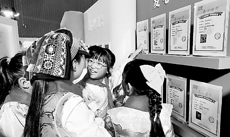 四川省阿坝州理县小朋友在2025天府书展参加“点亮阅读微心愿”活动。