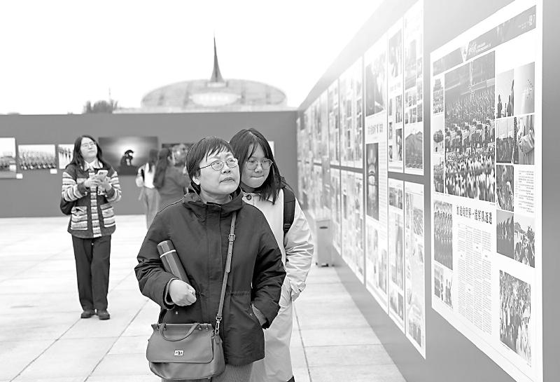 10月18日,北京中华世纪坛,北京国际摄影周之全国主流媒体新闻摄影展展览现场,观众正在浏览九三阅兵报纸摄影专题版面展示墙。