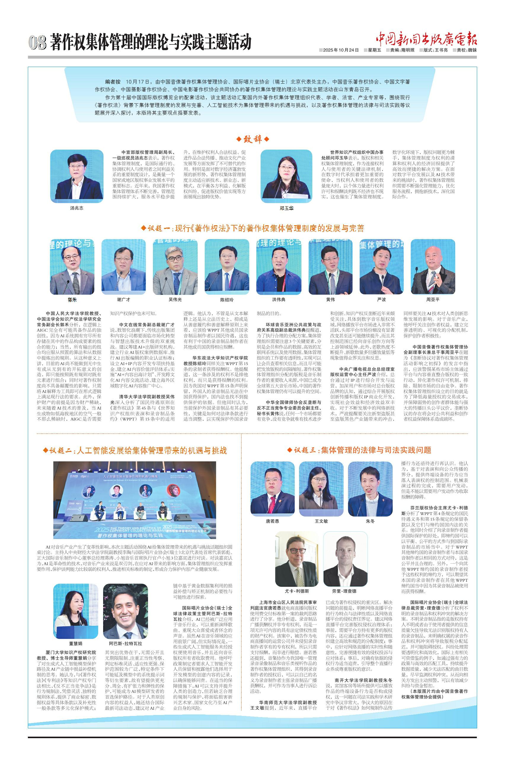 作为第十届中国国际版权博览会的配套活动,该主题活动汇聚国内外著作权集体管理组织代表、学者、法官、产业专家等,围绕现行《著作权法》背景下集体管理制度的发展与完善、人工智能技术为集体管理带来的机遇与挑战,以及著作权集体管理的法律与司法实践等议题展开深入探讨,本版将其主要观点择要发表。