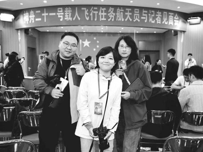 31日傍晚5点多,为抢占最佳拍摄机位,当戈壁的夕阳刚刚沉下去,杨海芸就带着马欢、赵强扛着设备冲向问天阁外圆梦园广场。3个多小时的等待里,饥肠辘辘的他们裹紧外套跺脚取暖,赵强和身旁的《中国航天报》的摄影老师开玩笑:“这是用饥寒交迫换与英雄同框。”话虽如此,却没人舍得离开半步。