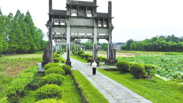 本报记者站在徽派建筑前。