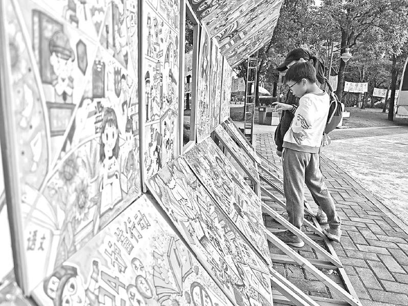 在广州市儿童公园“清风侠·护苗乐园”展出的漫画作品受到市民关注。